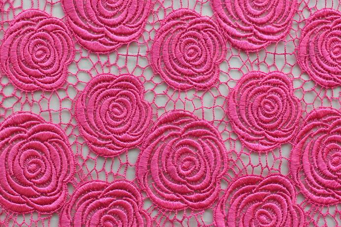 Features the branded VECINY casual jacket and a pair of dark wash jeans as examples of ready-to-wear, contrasted with the ornamental pink rose lace material.
